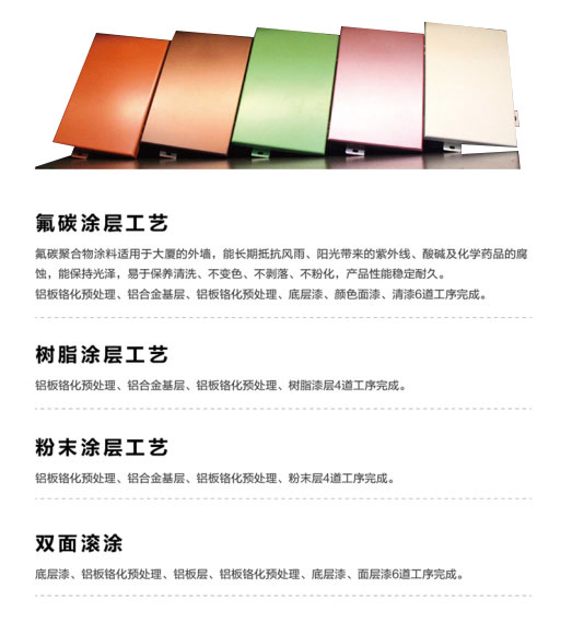 氟碳涂層具有抗腐蝕性和耐候性,耐冷性好,能抵御強(qiáng)烈的紫外線的照射,并長期保持不褪色、不粉化、涂屏均勻,色彩豐富多樣,使用壽命長。
